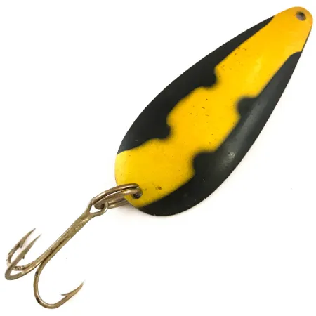 Le placage Rainbow Nickel au dos de cette cuillère offre un chatoiement irisé subtil qui contraste vivement avec la face peinte aux couleurs audacieuses. Clairement frappée du marquage « PRO- », cette cuillère American Sportsman Pro Spoon, portant le code produit 4799, présente un motif en blocs Noir et Jaune à haute visibilité. Le leurre mesure 6,5 cm (2 1/2") de long et pèse 10,5 g (3/8 oz), une taille polyvalente pour les configurations de lancer standard. L'anneau brisé et l'hameçon triple sont en excellent état, tout comme les surfaces peintes qui bénéficient d'une note de condition de 5/5. La fabrication américaine est évidente dans l'épaisseur du métal et les lignes épurées de son profil en goutte d'eau. Chaque détail, du pigment jaune éclatant au lustre irisé distinct au revers, reste bien défini et net.