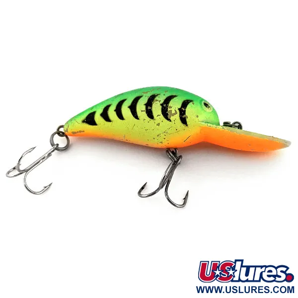 Arborant un coloris Fire Tiger éclatant, ce leurre vintage de fabrication américaine est conçu pour le lancer comme pour la traîne. Pesant 1/3 oz (10 g) pour une longueur de 2 1/4" (5,5 cm), le Producers B52 UV cible le doré et le brochet dans une zone de profondeur de 1,8 à 2,4 m (6–8 ft). Ce modèle flottant et bruiteur porte le code produit 13175 et se distingue par ses propriétés UV-réactives. Sous la lumière ultraviolette, la finition brille intensément, une caractéristique conçue pour augmenter la visibilité en eaux profondes ou teintées. L'armement se compose de deux hameçons triples piquants, et le corps présente de légères traces d'usure authentiques conformes à un état 4/5. La gorge orange vif et la bavette offrent un contraste saisissant avec le dos vert rayé de noir.