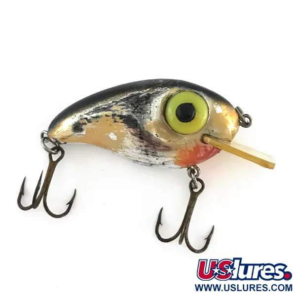 Avec un poids de 8,5 g (1/3 oz), ce Rabble Rouser Angel-Eye constitue un choix de taille pour les lancers de précision. Le corps argenté est rehaussé de touches dorées et noires le long du dos, tandis qu'une tache orange distincte marque la gorge. Doté de son emblématique « Angel-Eye », le leurre arbore de grands yeux jaunes saillants aux pupilles d'un noir profond qui servent de cible à fort contraste. Une bavette carrée transparente est fixée au nez pour faciliter une nage en profondeur. Ce leurre vintage de fabrication américaine, identifié par le code produit 8129, mesure 5 cm (2") et porte ses hameçons triples d'origine à finition bronze. Dans un état évalué à 4/5, le spécimen présente une légère usure cosmétique et un vieillissement naturel de la peinture, reflétant son passé dans une boîte de collectionneur. La construction du corps et l'emplacement des hameçons sont caractéristiques de l'époque de production de Rabble Rouser aux États-Unis.