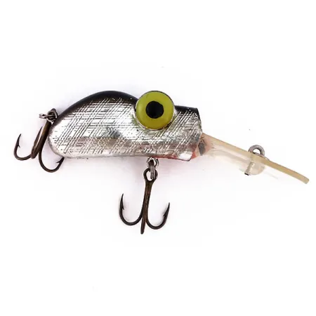 Un motif quadrillé argenté définit le profil de 4,5 cm (1 3/4") de ce spécimen fabriqué aux États-Unis. Pesant 9 g (1/3 oz), le Rabble Rouser Roo-Tur est équipé d'une large bavette en plastique transparent conçue pour des présentations en profondeur. Une touche de rouge à la base de la bavette ajoute un point de contraste subtil contre le corps métallique brillant. Deux hameçons triples à finition bronzée sont fixés au ventre et à l'arrière, tandis que les yeux jaunes surdimensionnés aux pupilles noires confèrent au leurre son visage emblématique. Répertorié sous le code produit 10278, le leurre est dans un état 5/5, sans aucune trace d'utilisation sur ses surfaces réfléchissantes. La texture en forme de grille sur les flancs imite un motif d'écailles complexe, soulignant le style de fabrication distinctif de la production américaine de Rabble Rouser.