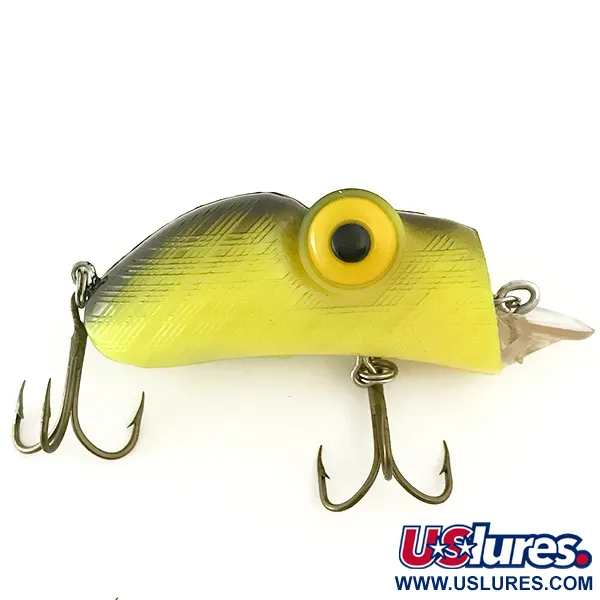 Les hachures croisées jaunes et noires sur le dos identifient immédiatement ce Rabble Rouser Rouster comme un exemplaire marquant de l'histoire du matériel de pêche américain. Mesurant 5,5 cm (2 1/4") et pesant 13 g (1/2 oz), ce modèle 6658 est conçu pour le lancer comme pour la traîne. Les yeux jaunes surdimensionnés avec leurs pupilles noires centrées donnent au leurre ce regard caractéristique aux yeux exorbités que les collectionneurs reconnaissent chez cette marque. En tant que modèle flottant et bruiteur, il est capable d'atteindre des profondeurs de 3,5 m (11,5 ft) lors de la récupération. La bavette transparente à paliers et les deux hameçons triples sont en excellente forme, reflétant son état 5/5. Comme tous les leurres de ce fabricant ont été produits exclusivement aux États-Unis, la fabrication conserve une qualité robuste adaptée à la traque du brochet ou du sandre.