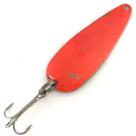 Le dos nickelé offre un contraste de flash intense avec la face avant fluorescente de cette cuillère de 6 cm (2 1/4"). Fabriquée aux États-Unis par Rainbow Plastics sous le code produit 8212, elle pèse 16 g (3/5 oz), offrant une masse suffisante pour des lancers précis vers les structures profondes. La finition est une combinaison classique Nickel / Rose, bien que le côté peint se présente comme un ton vif réagissant intensément à la lumière UV. Cette caractéristique de lueur UV est spécifiquement conçue pour rester visible pour les poissons même lorsque les couleurs standards s'estompent dans la colonne d'eau. Le spécimen montre des signes visibles de sa vie dans une boîte à pêche avec une perte de peinture honnête et une usure de surface le long des bords, résultant en une note d'état de 3/5. Elle conserve son armement d'origine, incluant un anneau brisé solide et un hameçon triple classique.