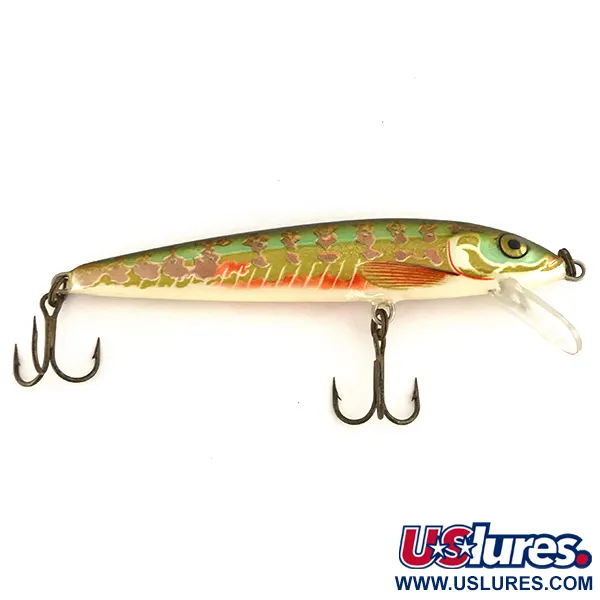 Un poids de 10 g (1/3 oz) confère à ce minnow de 10 cm (4") la densité nécessaire pour atteindre ses profondeurs cibles de 1,5 à 2,1 m (5-7 ft) au lancer comme à la traîne. La finition holographique de ce Rapala Husky Jerk Holo, identifié par le code produit 7477, présente un motif complexe de vert et d'or avec des barres verticales et un ventre crème doux. Fabriqué en Finlande, ce leurre est un véritable suspender conçu pour maintenir sa position dans la colonne d'eau lors des pauses. Les trois hameçons triples à finition bronze restent tranchants et bien fixés sur leurs attaches d'origine. Au niveau de la tête, les yeux jaunes réalistes et les accents branchiaux rouge-orangé fournissent les stimuli visuels requis pour des espèces comme le brochet, la perche et la truite fario. Ce spécimen est en excellent état (note 5/5) avec une bavette en plastique parfaitement transparente et intacte.