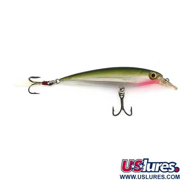 Des dégradés vert olive définissent le profil supérieur de ce spécimen de 1/4oz (7g) fabriqué en Estonie, un exemple remarquable de la série X-RAP. Mesurant 3 1/4" (8cm) de long, le corps présente une finition argentée texturée sur les flancs qui rejoint une section de gorge rouge-rosé près de la tête. Ce modèle, répertorié sous le code 9633, inclut une bavette transparente destinée à des profondeurs comprises entre 0,6 et 1,2 m (2-4 ft). Une caractéristique notable est l'hameçon arrière SureSet, habillé de plumes blanches et de tinsel réfléchissant pour offrir une cible d'attaque. Noté 5/5, ce leurre présente un extérieur propre avec des yeux holographiques 3D intacts et aucune usure visible sur les hameçons ou les anneaux brisés. La conception utilise un mécanisme interne de transfert de masse pour les lancers longs et une feuille holographique pour des reflets profonds.