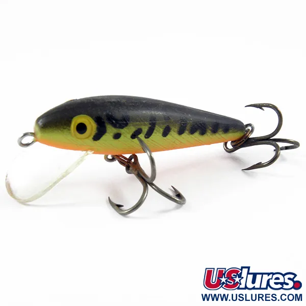 Le coloris vibrant Fire Tiger orne le profil mince de ce corps en plastique de 4 cm (1 1/2"), présentant des rayures noires sur un dégradé chartreuse et orange. Référencé sous le code 3269, ce Rebel Floater est un choix léger pour les amateurs de pêche finesse, pesant seulement 2 g (1/16 oz). Sa conception inclut une bavette transparente qui permet au leurre d'atteindre des profondeurs de 0,9 m (3 ft) en lancer-ramener ou à la traîne. L'armement se compose de deux hameçons triples piquants solidement fixés sous le ventre et à la queue. Fabriqué aux États-Unis, la finition de cet exemplaire est exceptionnellement soignée, confirmant qu'il s'agit d'un article neuf. La peinture est lisse et les yeux jaunes sont parfaitement centrés, reflétant le contrôle qualité renommé de Rebel. Ce modèle s'utilise généralement avec une récupération linéaire ou une technique stop-and-go.