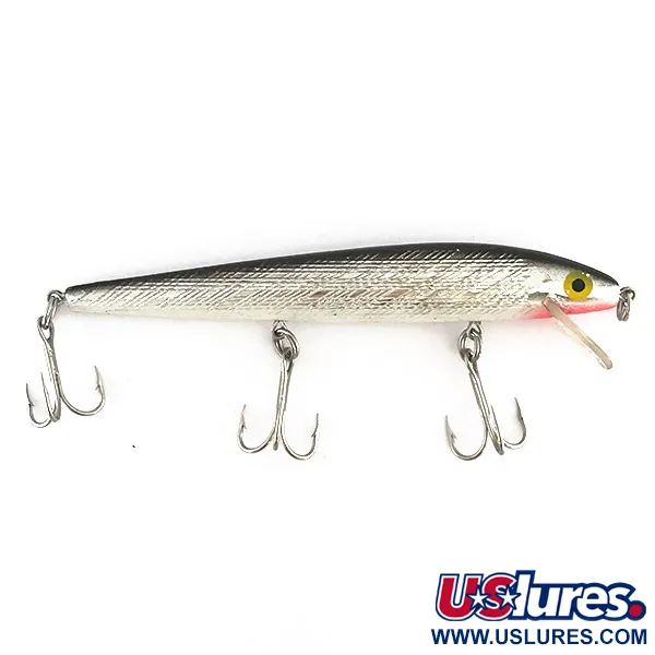 Mesurant 12 cm de long, ce Rebel Floater fabriqué aux États-Unis arbore un profil classique à écailles argentées. Référencé sous le code 8406, ce leurre présente une finition argentée traditionnelle associée à un dos sombre et une touche rouge caractéristique sous le menton. Pesant 10 g, sa structure en plastique est conçue pour diverses animations, comme la récupération linéaire ou le "stop-and-go", en lancer-ramener ou à la traîne. Sa bavette transparente permet d'atteindre des profondeurs comprises entre 0,9 m et 2,1 m. Équipé de trois hameçons triples tranchants, il possède des yeux jaunes à pupilles noires pour un réalisme accru. Ce modèle est en parfait état (5/5), avec une finition et un armement remarquablement préservés.