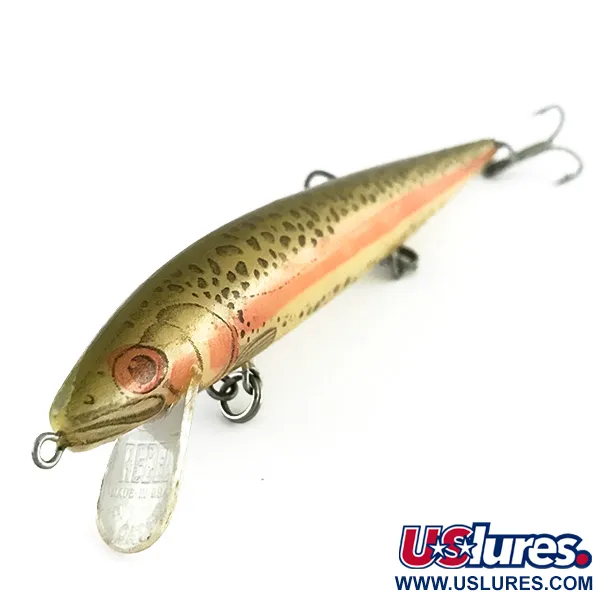 Habillé d'un motif truite classique, ce poisson-nageur en plastique de 10g présente les finitions détaillées qui ont fait la renommée de Rebel. Mesurant 12cm, le leurre possède un corps aux reflets dorés avec une ligne latérale rose proéminente et des points sombres typiques d'une truite arc-en-ciel. La bavette transparente, estampillée du logo Rebel et « MADE IN USA », est conçue pour atteindre des profondeurs de 0,9 à 1,8m au lancer ou à la traîne. Trois hameçons triples sont fixés par des anneaux brisés robustes sous le ventre et à la queue, offrant un profil classique à ce leurre flottant. Ce spécimen particulier, identifié par le code produit 8506, est dans un état 5/5, conservant son éclat d'origine et la clarté de ses yeux. Le passage de la fabrication au plastique a permis ces motifs d'écailles complexes et ces chambres internes qui ont défini la gamme de minnows flottants de la marque.