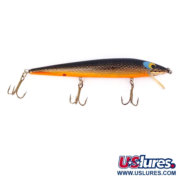 Des écailles cuivrées et dorées ornent les flancs de ce poisson-nageur flottant de 9 g (1/3 oz). Le Rebel Floater F12, identifié par le code 10646, présente un dos noir contrasté et un ventre orange vif, accentué par un petit point d'attaque rouge près de la queue. Un élément de design emblématique est le grand œil peint avec son cercle bleu et son iris jaune, une esthétique classique issue de sa fabrication aux États-Unis. Mesurant 12 cm (4 3/4"), le leurre est équipé de trois hameçons triples bronzés et d'une bavette en plastique transparent permettant une profondeur de nage de 1,5 à 2,1 m. Son état est excellent (5/5), avec une finition et un armement d'origine parfaitement conservés.