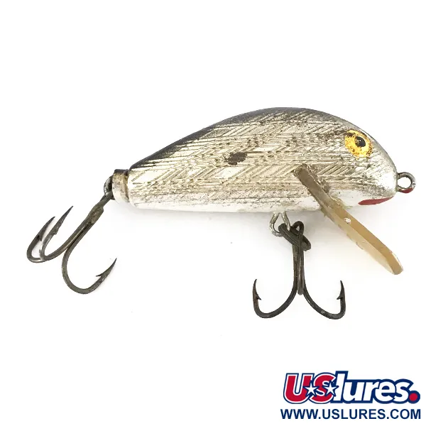 Une peinture argentée (S) avec un motif détaillé de hachures croisées recouvre le corps de ce REBEL HUMPBACK vintage, portant le code produit 7837. Pesant 7 g (1/4 oz) pour une longueur de 4,4 cm (1 3/4"), ce leurre fabriqué aux États-Unis présente un profil arqué caractéristique qui a donné son nom au Humpback. Sa bavette en plastique transparent est inclinée pour la prospection en eaux peu profondes, atteignant des profondeurs allant jusqu'à 1,2 m, ciblant des espèces comme la perche, le chevesne ou le brochet. Des yeux jaunes proéminents avec des pupilles noires sont insérés dans la tête, offrant une cible visuelle classique. Côté armement, le leurre est équipé de deux hameçons triples à finition sombre, présentant de légers signes d'utilisation conformes à son état de 4/5. La finition métallique reste brillante sur les écailles et le ventre, reflétant la qualité des matériaux utilisés par Rebel à cette époque.
