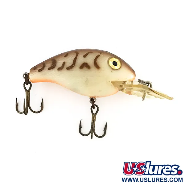Le corps de couleur crème de ce leurre est orné d'un motif Brown Tiger distinctif, avec des rayures brunes audacieuses sur le dos et les flancs. Ce Rebel Shallow Fastrac, portant le code produit 8161, a été fabriqué aux USA et pèse 9 g (1/3 oz). D'une longueur de 5,5 cm (2 1/4"), il est équipé d'yeux prismatiques dorés qui captent la lumière sous différents angles. Conçue pour une profondeur de nage comprise entre 0,6 et 1,8 m, sa bavette en plastique transparent est spécifiquement inclinée pour les techniques de prospection peu profonde, comme le lancer-ramener ou la traîne à proximité des structures. L'armement se compose de deux hameçons triples bronzés, et ce spécimen affiche un état exceptionnel noté 5/5. Le ventre assure la transition entre les flancs rayés et un éclat perlé doux, typique des séries vintage Rebel de cette époque.