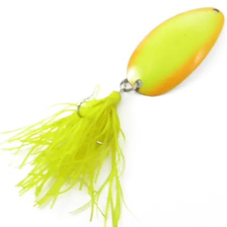 Le chrome argenté au dos de cette cuillère de 6 cm (2 1/4") offre un éclat haute visibilité qui complète la face avant jaune vif et orange. Portant le code produit 3812, ce modèle Red Eye Lures fabriqué aux États-Unis est lesté à 10,5 g (3/8 oz) pour les profondeurs de traîne. Une jupe en silicone souple de couleur chartreuse assortie est fixée à l'anneau brisé arrière, masquant l'hameçon simple et ajoutant une texture différente au profil. Ce modèle RED EYE est présenté dans un état 4/5, montrant une peinture bien conservée sur la face convexe et une finition métallique propre sur l'intérieur concave. Les points d'attache sont structurellement sains, avec un œillet unique à la tête pour une connexion directe de la ligne ou un agrafe.