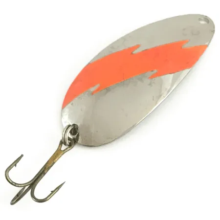 Le placage au nickel offre une base classique à haute brillance pour cette cuillère de 10,5 g (3/8 oz), qui présente un motif d'éclair distinctif orange fluorescent sur son côté convexe. Mesurant 6 cm (2 1/4"), la cuillère Red Eye (code 6626) témoigne de la précision de la fabrication américaine, avec le nom de la marque Red Eye Lures frappé nettement à l'intérieur de la face concave. Ce spécimen de traîne spécifique est dans un état 5/5, conservant un fini brillant et réfléchi ainsi que des pigments vifs sans usure notable. L'armement se compose d'un hameçon triple robuste fixé par un anneau brisé renforcé, conçu pour résister aux pressions de la traîne en eau profonde. Un point d'attache propre au nez permet un nœud direct ou une connexion par agrafe, préservant le profil profilé du leurre.