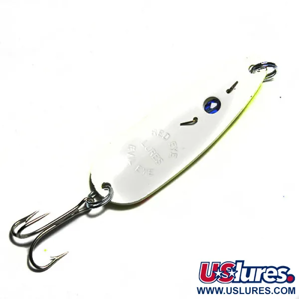 Une finition jaune haute visibilité permet à ce leurre de 3" (7,5 cm) de se démarquer dans toute collection. Identifiée par le code produit 0286, l'Eppinger Red Eye Evil Eye est une cuillère ondulante classique fabriquée aux USA qui présente la configuration matérielle emblématique de la marque, notamment l'œil en perle de verre bleue câblé au centre du corps métallique. Ce spécimen de 3/4oz (22g) arbore un motif de points orange vifs sur une base jaune néon, avec une finition blanche contrastée sur l'envers. La cuillère est équipée d'anneaux brisés argentés d'origine et d'un hameçon triple piquant, le tout en état 5/5 en tant qu'exemplaire inutilisé de l'histoire de la pêche. Ce design particulier reflète l'époque après l'acquisition de la société Red Eye par Eppinger, conservant la caractéristique spécialisée de l'œil en perle recherchée par les collectionneurs. Son corps métallique épais est conçu pour le lancer et la traîne dans diverses conditions d'eau.