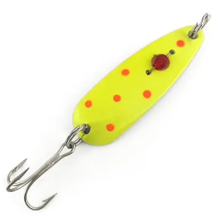 Mesurant 5,7 cm (2 1/4"), cette cuillère ondulante classique présente une base jaune éclatante ponctuée de points orange-rose distincts. La perle rouge facettée emblématique est solidement fixée au centre du corps métallique, un élément de design indissociable des leurres Red Eye Lures fabriqués aux États-Unis. Pesant 14 g (1/2 oz), cette cuillère est conçue pour des applications polyvalentes de lancer lourd ou de traîne. La finition UV spécifique de ce modèle Red Eye Evil Eye offre un éclat brillant et contrasté lorsqu'elle est exposée à la lumière ultraviolette. Référencé sous le code 7366, le fini du leurre est remarquablement préservé. Inutilisé et dans un état exceptionnel, il témoigne du contrôle qualité de la fabrication originale aux USA. Un hameçon triple renforcé et des anneaux brisés en acier inoxydable complètent l'armement, garantissant une efficacité totale pour le pêcheur comme pour le collectionneur.