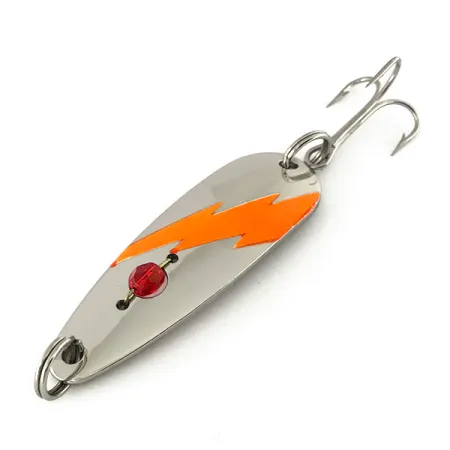 Le placage en nickel crée un arrière-plan à fort éclat pour l'autocollant en forme d'éclair orange vif de ce Red Eye Lures Evil Eye UV. Identifiée par le code produit 7556, cette cuillère à lancer pèse 1/2 oz (14 g) et mesure 2 1/4" (5,7 cm). Une caractéristique emblématique de ce modèle fabriqué aux USA est la perle rouge facettée fixée dans le corps de la cuillère près de l'anneau brisé de tête, qui capte la lumière différemment du métal poli. Lorsqu'il est exposé à la lumière ultraviolette, l'éclair orange fluorescent réagit avec un éclat brillant, facilitant la visibilité dans les eaux plus profondes ou plus sombres. Le leurre est équipé d'un hameçon triple standard et d'anneaux brisés. Cet article spécifique est à l'état neuf, présentant la finition d'usine originale sans aucun signe d'usure.