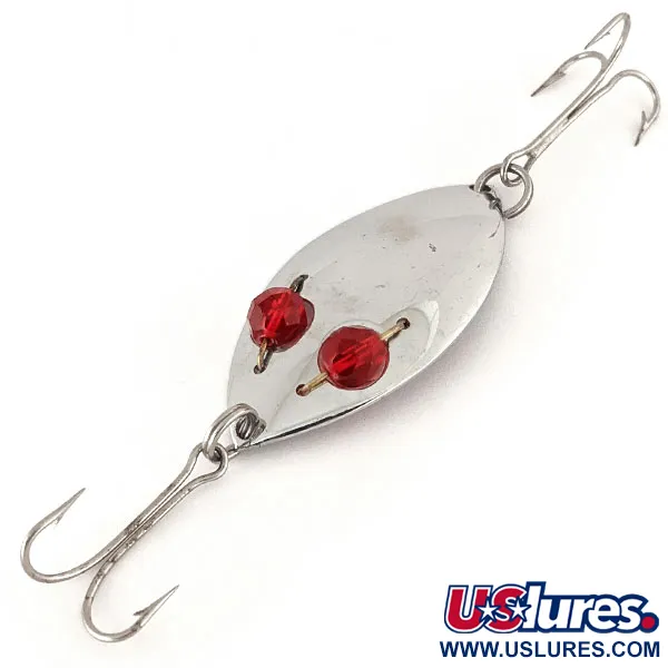 De grands yeux rouges réfléchissant la lumière définissent l'attrait visuel de cette cuillère au fini nickel, portant le code produit 12440. Pesant 13 g (1/2 oz) et mesurant 5,5 cm (2 1/4"), la Red Eye junior de Hofschneider Corp. est un incontournable du matériel vintage américain. Le corps fabriqué aux États-Unis est conçu pour des techniques favorisant une récupération lente, permettant aux brochets et aux perches de se concentrer sur l'éclat du métal pendant les chaleurs estivales. Deux hameçons triples acérés sont montés à chaque extrémité du leurre, offrant plusieurs points d'attaque pour les prédateurs curieux. Ce spécimen affiche une note d'état de 5/5, présentant une surface polie bien conservée et un montage solide pour les perles rouges facettées. Le marquage du fabricant sur le côté concave reste net et lisible, confirmant son héritage en tant que pièce authentique de l'histoire de la pêche du milieu du siècle.