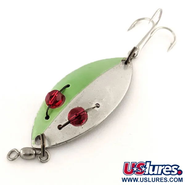 Deux perles de verre rouge facettées se détachent sur le corps en nickel embouti, constituant la caractéristique emblématique de cette Eppinger Red Eye junior. D'une longueur de 5,5 cm (2 1/4"), cette cuillère présente une esthétique bicolore avec une peinture vert citron couvrant la moitié de la surface en nickel poli. Ce modèle spécifique, code produit 12801, est conçu pour une récupération lente, faisant de cette cuillère un classique historique pour la traque du brochet et de la perche en été. Le revers est clairement marqué « RED EYE SPINNING LURE », identifiant sa place dans la lignée du matériel de pêche de fabrication américaine provenant des États-Unis. Pesant 11 g (2/5 oz), l'armement comprend un large hameçon triple et un émerillon baril pré-installé. Dans un état 5/5, la finition est exceptionnellement bien conservée et les couleurs restent éclatantes sur toute la surface métallique.