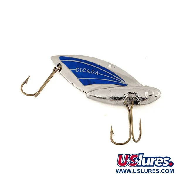 Les surfaces nickelées s'associent à un contraste bleu profond sur ce modèle 11470, mettant en valeur l'estampille 'CICADA' centrée sur son aile métallique. Avec un poids de 11 g (2/5 oz) et une longueur de 5 cm (2"), cette lame vibrante est conçue pour le jigging vertical ou les pêches au lancer. L'armement se compose de deux hameçons doubles bronzés, l'un ventral et l'autre en queue, conçus pour limiter les accrocs. Ce spécimen fabriqué aux USA est classé 5/5, présentant un logo net et une peinture bien conservée sur les accents bleus. Le corps en plomb est moulé solidement autour de la base de la lame, offrant la densité nécessaire pour les techniques de fond.