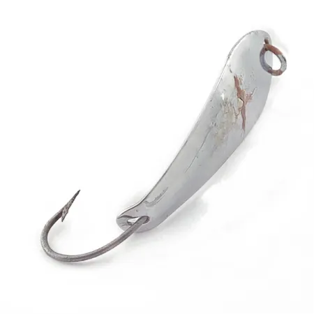 Un placage en nickel recouvre le corps de 4,5 cm (1 3/4") de cette cuillère vintage, présentant des signes d'utilisation correspondant à une évaluation d'état de 3/5. Pesant 4,5 g (3/16 oz), le corps métallique est estampillé des marquages du fabricant, confirmant qu'il s'agit d'une Barracuda Reflecto #1, code produit 23565. Ce spécimen fabriqué aux États-Unis est doté d'un hameçon simple relié par un anneau brisé à la queue, une configuration robuste conçue pour le lancer ou la traîne. Des points d'oxydation visibles sont présents sur la surface supérieure près de l'attache, bien que l'éclat métallique reste prédominant sur le reste du corps. Un anneau simple est monté en tête pour une fixation sûre de la ligne.
