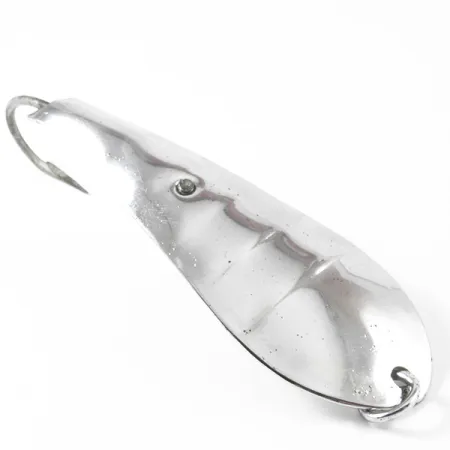 Un placage nickel poli recouvre le corps de 9,5 cm (3 3/4") de cette cuillère fabriquée aux États-Unis, offrant une surface à haute réflexion adaptée à diverses conditions de luminosité. Un hameçon simple robuste est fixé sur la face concave à l'aide d'un assemblage vis-rondelle, caractéristique principale du design Luhr Jensen 3312 weedless. L'estampage à l'intérieur reste net, affichant clairement la marque du fabricant et la désignation du modèle Reflecto. Conservant son éclat d'origine avec une note d'état de 4/5, la surface présente des signes mineurs de vieillissement qui n'altèrent en rien son utilité. Ce spécimen de 21 g (3/4 oz) présente un œil estampé distinctif sur le tiers supérieur de la palette, destiné à fournir un point de mire pour les carnassiers. Le protège-pointe en fil d'acier est toujours ferme, prêt pour une récupération à travers la végétation dense ou le bois mort.