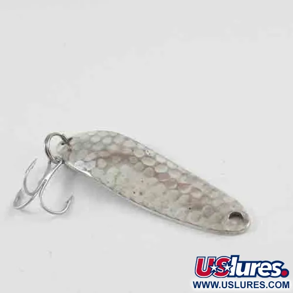 Une texture argentée martelée recouvre la face convexe de cette cuillère vintage, offrant une surface multi-facettes conçue pour capter et renvoyer la lumière dans toutes les directions. Mesurant 5,5 cm de long, la Renegade (code 2922) présente un profil substantiel pour son poids de 9 g, ce qui en fait un choix fiable pour les lancers à longue distance ou la traîne constante. Le revers est lisse et poli, une caractéristique typique du matériel de pêche japonais de haute qualité de cette époque. Ce spécimen présente de légers signes de manipulation, conservant un état solide de 4/5. Un seul anneau brisé fixe un hameçon triple robuste à la queue, tandis que la tête dispose d'un œillet propre pour un montage direct. La précision de fabrication japonaise est évidente dans le martelage uniforme et le biseau du métal, ce qui aide le leurre à nager de manière prévisible dans l'eau.
