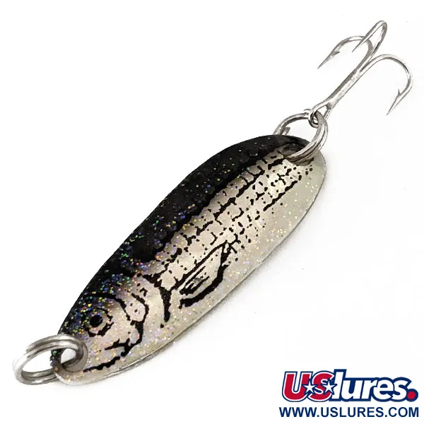 Mesurant 4 cm (1 1/2"), la Renegade Crystalina Spoon - Honeycomb Series présente une finition Minnow distinctive où un dos noir pailleté rencontre une base argentée ornée d'une tête de poisson et d'écailles détaillées. Cette cuillère de 7 g (1/4 oz), référencée sous le code 11188, est équipée d'anneaux brisés robustes et d'un hameçon triple piquant en queue. Le revers de la palette est d'un argent poli pur, offrant un contraste éclatant avec la face décorée. L'état est évalué à 5/5, la finition et l'armement étant impeccables.