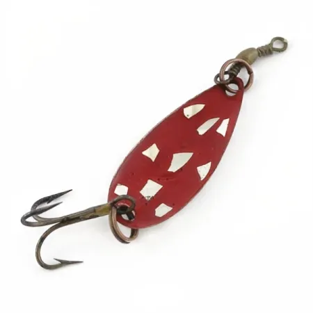 Pesant à peine 1,5 g (3/64 oz), cette petite cuillère constitue une pièce classique de l'histoire de la pêche américaine signée Roy Self. Mesurant 3,3 cm (1 1/4 po) de long, ce modèle présente une face peinte en rouge vif, parsemée d'éclats de nickel irréguliers qui produisent des reflets multidirectionnels. Le revers laisse apparaître une finition en nickel poli et propre, où le nom du fabricant et le numéro du modèle sont clairement gravés dans le métal. Cette Roy Self #1 spécifique, portant le code produit 23911, est équipée de ses accessoires d'origine, notamment un petit émerillon baril de couleur laiton et un hameçon triple à finition bronze. Dénicher ces petites tailles dans un tel état de conservation est une aubaine pour toute collection, car la peinture de ces leurres souffre souvent de l'usure due au stockage ou aux chocs. L'état de cet exemplaire est noté 5/5, présentant une surface remarquablement bien conservée, tant du côté peint que du côté métallique. Sa conception ultra-légère était initialement destinée au lancer ultra-léger ou à la traîne pour la truite et les petits carnassiers. Les anneaux brisés et l'émerillon restent robustes et prêts pour une mise en exposition.