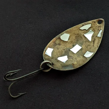 Une forme de goutte d'eau distinctive caractérise cette rareté de fabrication américaine, qui arbore une face avant dorée incrustée de manière unique de plusieurs fragments de miroir angulaires. Le marquage « ROY SELF » ainsi que le numéro de modèle 4 sont clairement étampés sur le revers en nickel poli. Pesant 3/16 oz (5 g) pour une longueur de 2" (5 cm), la conception de cette cuillère privilégie une forte réflexion de la lumière pour prospecter différentes profondeurs. Ce spécimen, répertorié sous le code produit 22505, affiche de légers signes du temps qui soulignent son caractère vintage tout en conservant un état de 4/5. Un hameçon triple classique reste fixé via un anneau brisé, associé à un simple trou d'attache à l'extrémité effilée.