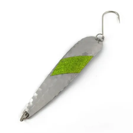 Pesant 16 g (3/5 oz), le corps en métal martelé de cette cuillère ondulante présente une surface texturée conçue pour capter la lumière grâce à un motif en nid d'abeille. Une bande oblique de paillettes vertes éclatantes est appliquée au centre de la finition argentée, servant de point focal visuel. Mesurant 11,5 cm (4 1/2") de long, ce leurre est équipé d'un hameçon simple robuste et d'anneaux brisés en tête et en queue. Identifié par le code produit 23629, ce modèle Sammy PAC (07) date de 1986 et reflète le style de fabrication de cette époque. Son état montre les marques d'une longue histoire de pêche, avec une usure de surface et de l'oxydation qui lui confèrent un caractère authentique et bien utilisé, évalué à 1/5.