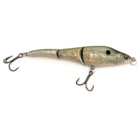 Mesurant 9,5 cm (3 3/4"), ce swimbait articulé présente une conception de corps distinctive en trois sections qui caractérise son profil structurel. La finition de ce Sebile Magic Swimmer Sinking 95 présente un motif de poisson-fourrage naturel, avec un dos vert olive foncé passant à des écailles holographiques argentées et dorées le long des flancs. Une tache noire proéminente est située juste derrière la tête, imitant l'apparence d'un shad. Avec un poids de 10,5 g (3/8 oz), le leurre est équipé de deux hameçons triples sombres — l'un monté sur le ventre du premier segment et l'autre à la queue. Portant le code produit 13018, ce modèle coulant permet de couvrir différentes profondeurs selon la vitesse de récupération et le temps de descente. C'est un leurre bruiteur, de style rattlin, conçu pour le lancer comme pour la traîne. Fabriqué aux États-Unis, cet exemplaire est classé en condition 5/5, ne montrant aucun signe d'usure sur les charnières articulées ou la finition réfléchissante, et convient parfaitement pour cibler l'aspe, le saumon, la perche ou le brochet.