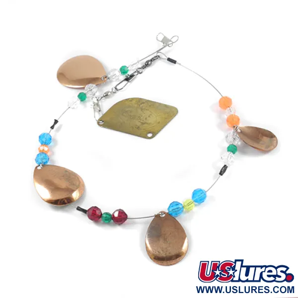 Quatre palettes cuivrées distinctes en forme de goutte sont stratégiquement espacées le long de l'armature en fil de fer de cet attracteur de traîne classique fabriqué aux États-Unis. Produit par SEP'S et identifié par le code 2399, ce montage mesure 50 cm et comporte un assortiment de perles en plastique facettées vert émeraude, bleu ciel, ambre et transparentes. Une plaque de dérive centrale en laiton estampillée du logo du fabricant agit comme stabilisateur pour l'ensemble du montage de 24 g. L'assemblage utilise des émerillons et des agrafes de haute qualité, reflétant la durabilité attendue pour la traîne profonde. Présentant de légers signes d'utilisation, les surfaces métalliques et le fil restent en excellent état, avec une note de 4/5. Chacune des quatre palettes conserve un fini brillant et réfléchissant qui complète les accents de perles multicolores.