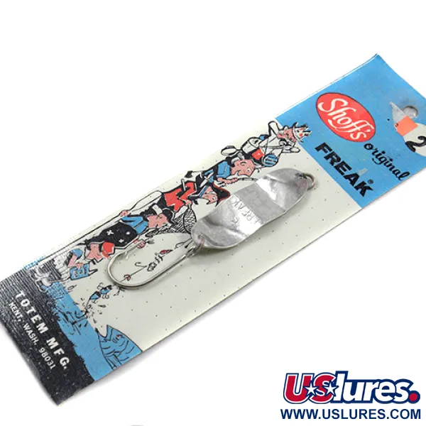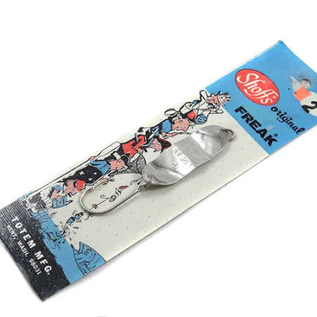 Le numéro « 2 » ainsi que le nom du modèle « FREAK » sont clairement estampillés sur la palette argentée réfléchissante, identifiant cette cuillère classique du Nord-Ouest. Produit sous la marque Shoff's et distribué par Totem Mfg. à Kent, Washington, ce leurre de 5,5 cm (2 1/4") témoigne du savoir-faire de qualité du matériel de pêche américain vintage. Le plaquage en argent est exceptionnellement propre car l'article est neuf, conservant son éclat d'origine sans aucun signe d'âge ou d'usure de stockage. Avec un poids de 12 g (2/5 oz), la palette est associée à un hameçon simple renforcé conçu pour des ferrages sûrs. Le carton d'exposition d'origine présente de charmantes illustrations de pêcheurs du milieu du siècle, ajoutant une dimension historique au code produit 1885. Sa forme distinctive et sa surface texturée sont les marques d'un design destiné au lancer ou à la traîne dans diverses conditions d'eau.