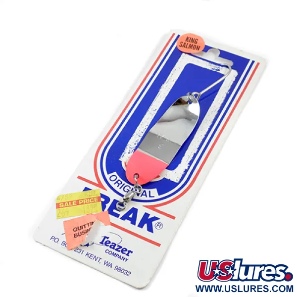 Une pointe rouge/rose mat offre un contraste visuel net avec le corps en nickel poli de cette cuillère Shoff's Freak 3. Pesant 9 g (1/3 oz), le leurre présente un profil distinctif en courbe en « S » et porte le chiffre « 3 » estampillé au verso pour indiquer sa taille. Produit par la Teazer Company de Kent, Washington, ce modèle spécifique — identifié par le code produit 1893 — était initialement commercialisé pour le Saumon Royal. Mesurant 7 cm (2 3/4"), l'armement se compose d'un émerillon baril monté à l'avant et d'une structure à fil traversant conçue pour une récupération linéaire ou la traîne. Bien que l'emballage en carton d'origine présente une certaine usure et des déchirures près des anciens autocollants de prix, le leurre lui-même est neuf.
