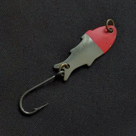 Une finition classique en nickel et peinture rouge définit ce spécimen de 3 cm (1 1/4"), illustrant la conception axée sur la finesse du Shoff's Triple Teazer. Pesant seulement 1,1 g (1/32 oz), son corps en métal estampé présente un profil de poisson distinctif qui souligne son héritage de fabrication américaine. Sur la face concave inversée, le poinçon du fabricant est clairement visible, identifiant le leurre sous le code produit 22327. L'armement se compose d'un hameçon simple affûté fixé par un anneau brisé en laiton, destiné aux pêches ultra-légères de la truite ou des petits carnassiers. Concernant son état, cette pièce est notée 5/5, affichant une surface bien conservée où le nickel poli et la peinture rouge éclatante sur la tête restent brillants et intacts. Un second anneau brisé en laiton au niveau du nez constitue le point d'attache principal pour la ligne du pêcheur.