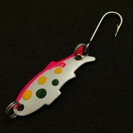 Pesant seulement 1,1 g (1/32 oz), ce Triple Teazer de Shoff's est un modèle miniature mais très détaillé de matériel de finesse de fabrication américaine. Ce leurre de 3 cm (1 1/4"), portant le code produit 23537, est doté d'un corps métallique avec une finition argentée et une bande dorsale rose vif. Une série de trois points jaunes et deux points vert forêt sont peints sur le flanc, créant un motif contrasté sur le métal brillant. En état 5/5, la peinture est parfaitement intacte et les surfaces métalliques sont propres. L'armement comprend deux anneaux brisés et un hameçon simple à l'arrière, ce qui est typique de ce modèle conçu pour le lancer léger. Bien que le catalogue indique le cuivre comme couleur de base, le placage visible sur cet exemplaire est un argent réfléchissant. Le profil de queue étagé et la silhouette pisciforme définissent le caractère physique du Triple Teazer, ce qui en fait un outil spécialisé pour cibler la truite ou les petits carnassiers.