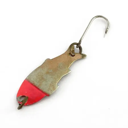 Une touche éclatante de peinture rouge souligne le nez de cette cuillère au corps en cuivre, créant un aspect bicolore distinctif. Cette Shoff's Triple Teazer, référencée sous le code produit 23602, mesure 3 cm et affiche un poids de seulement 1,1 g. Fabriqué aux États-Unis, ce leurre présente un profil estampé en forme de poisson avec une section de queue évasée où est fixé l'hameçon simple. L'armement est fonctionnel, comprenant un anneau de couleur laiton qui relie l'hameçon au corps principal. Concernant son état 4/5, les surfaces métalliques présentent une légère usure et une patine de la finition d'origine, bien que les accents rouges restent nets et visibles. Les pêcheurs utilisent généralement ces cuillères légères pour le lancer ultra-léger ou comme teaser. L'attache se situe directement à travers le nez peint, accentuant son profil effilé.
