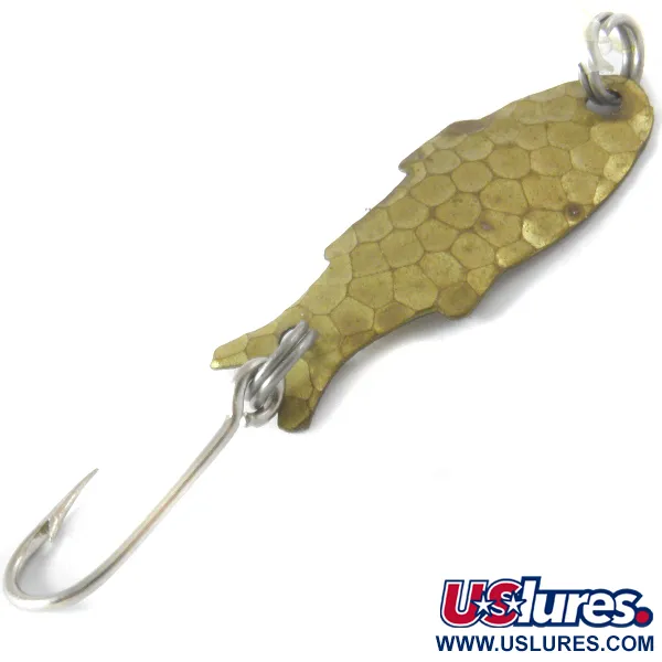 La texture en laiton martelé confère un aspect écailleux distinct à cette cuillère vintage, l'aidant à imiter le petit poisson fourrage en eaux claires. Mesurant 3 cm (1 1/4") et pesant 1,1 g (1/32 oz), la Shoff's Triple Teazer est un classique ultra-léger provenant des États-Unis. Cet exemplaire particulier, portant le code produit 4099, se présente dans un état 4/5 avec des surfaces propres et des nageoires estampées bien définies le long des bords de son corps pisciforme. Elle dispose d'anneaux brisés argentés en tête et en queue, montés avec un hameçon simple piquant. Sa silhouette imite un petit vairon, avec une queue effilée et une tête légèrement plus large. La finition martelée à l'avant crée des reflets lumineux multidirectionnels, tandis que le dos concave reste lisse, laissant transparaître la couleur laiton d'origine.