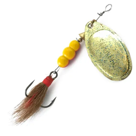 Orné de trois perles jaunes vibrantes, l'axe métallique de cette cuiller vintage mène à un hameçon triple soigneusement habillé. La palette dorée présente une finition pailletée bleue unique qui offre une texture visuelle distincte par rapport au laiton standard, et elle est clairement estampillée du nom Silverlake. Pesant 9g (1/3oz) et mesurant 7cm (2 3/4"), ce classique fabriqué aux États-Unis (code 5558) représente un bel exemple de conception d'accessoires de pêche du milieu du siècle. Un plumage brun est solidement fixé par une ligature en fil rouge frappante, créant un contraste net avec les composants jaunes du corps. Ce spécimen spécifique conserve une note de condition de 5/5, le placage à l'or et l'application de paillettes restant brillants et l'armature ne montrant pratiquement aucun signe d'âge. L'œillet métallique supérieur est prêt pour une agrafe ou un nœud direct, comme utilisé dans les montages traditionnels de lancer ou de traîne.