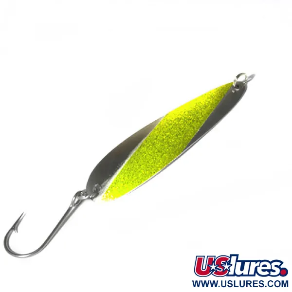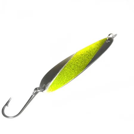 Pesant 11,5 g (2/5 oz), cette cuillère Slammer présente une bande diagonale distinctive pailletée dorée sur un corps en nickel poli. Fabriquée aux USA, cette spécialiste de la traîne de 9,5 cm (3 3/4") porte le nom du fabricant frappé directement sur le revers en nickel propre. Le modèle 0480 est conçu pour les travaux intensifs avec un hameçon simple robuste fixé par un anneau brisé solide, une configuration privilégiée par les pêcheurs des Grands Lacs et des côtes pour capturer des espèces aux mâchoires puissantes. La finition offre un flash à haut contraste, combinant la qualité réfléchissante du nickel au chatoiement texturé de l'accent doré-chartreuse. Maintenue à un état de 4/5, les surfaces métalliques conservent leur éclat d'origine et l'armement reste serré et fonctionnel. Conçu spécifiquement pour le rythme régulier de la traîne, le profil allongé et svelte de la Slammer 0480 est profilé pour une stabilité parfaite à diverses vitesses.