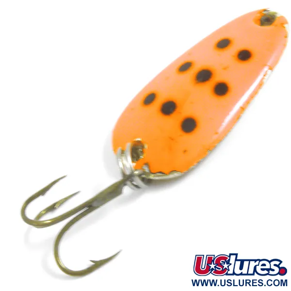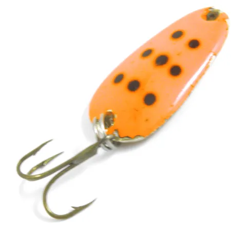 Clairement estampillé sur le revers doré, le marquage 'SØLV-KROKEN NORWAY' identifie cette cuiller de 3 cm comme un exemple classique du savoir-faire scandinave. Pesant 7 g, ce leurre arbore un motif Rouge / Or haute visibilité, avec une face avant orange vif ponctuée de sept points sombres. L'armement se compose d'un unique hameçon triple fixé par un anneau brisé à la base, adapté à diverses techniques de lancer et de traîne. Ce spécimen particulier, identifié par le code produit 4437, affiche une note d'état de 4/5, ne présentant qu'une usure de surface mineure respectant son âge tout en restant structurellement sain. Les origines norvégiennes de la marque Sølvkroken sont évidentes dans la fabrication en métal massif et l'estampillage précis sur le dos poli.