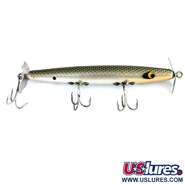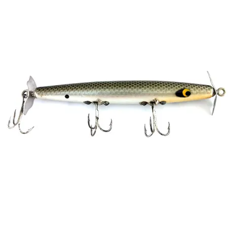 Un motif d'écailles en filet fin recouvre le dos vert-argenté de ce leurre de surface en bois, passant harmonieusement à un ventre crème pâle. Mesurant 11,5 cm (4 1/2"), le corps élancé en bois reflète la qualité attendue d'un Smithwick Devil's Horse fabriqué aux États-Unis sous le code produit 9692. L'armement reste brillant, comprenant deux hélices métalliques conçues pour l'agitation de surface à 0 m de profondeur et trois hameçons triples piquants. À 9 g (1/3 oz), le leurre est lesté spécifiquement pour la précision des lancers tout en maintenant une flottabilité élevée. Des yeux jaunes peints à la main avec de grandes pupilles noires constituent un point focal sur la finition écaillée. Ce spécimen affiche un état de 5/5, avec une finition propre et des hélices métalliques bien conservées. Un point noir unique est positionné sur le côté arrière du corps, une caractéristique distincte de cette série vintage.