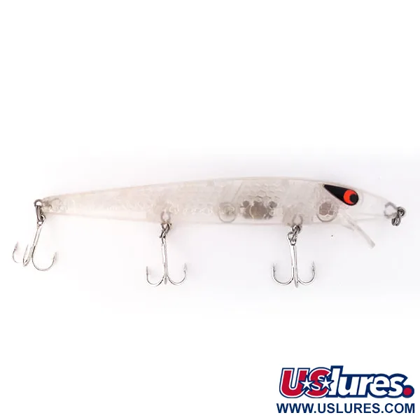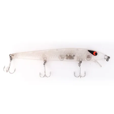 Des écailles blanc transparent enveloppent le corps de 13 cm de ce jerkbait, offrant une présentation subtile idéale pour les eaux claires. Pesant 13 g, le Smithwick Suspending Rattlin’ Rogue est conçu pour rester en suspension à une profondeur précise lors des pauses. Ce modèle, portant le code produit 10481, témoigne du savoir-faire américain traditionnel de la marque Smithwick. Au lancer, le leurre atteint des profondeurs de 0,3 m à 2 m, et peut plonger jusqu'à 3 m ou 4 m en traîne. Les trois hameçons triples et les composants structurels sont dans un état 5/5, ne montrant aucun signe d'usure sur la finition ou sur les yeux rouges et noirs proéminents. La chambre de rattle interne et les masselottes d'équilibrage sont visibles à travers la coque en plastique translucide.
