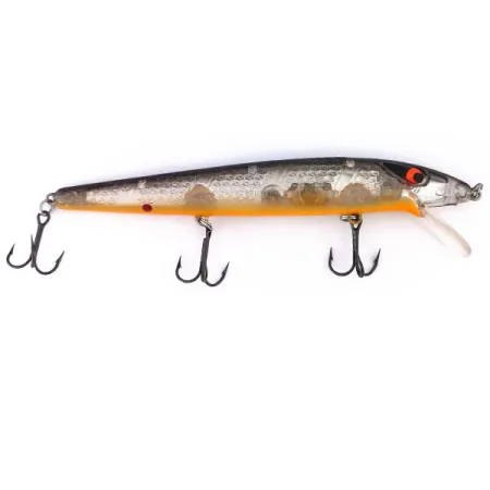 Pesant 1/2 oz (13 g), ce jerkbait au corps allongé illustre le savoir-faire américain traditionnel associé à la marque Smithwick. Son profil de 5" (13 cm) arbore une finition contrastée avec un dos noir, des flancs argentés aux écailles texturées et un ventre orange vif. De grands yeux rouges translucides, signature visuelle de la série Suspending Rattlin’ Rogue, sont intégrés à la tête. Ce modèle spécifique, portant le code produit 10889, est dans un état 5/5 avec des surfaces impeccables et un armement tranchant. Le système de billes internes produit la signature acoustique renommée de ces leurres. Conçu pour rester en suspension dans la colonne d'eau, il plonge entre 0,3 m et 2 m au lancer, et atteint 3 m à 4 m en traîne. Trois hameçons triples d'origine sont fixés sous le corps, assurant l'équilibre nécessaire à sa flottabilité neutre.