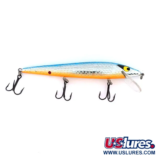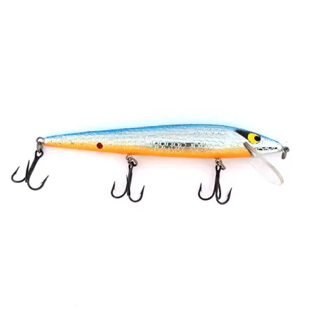 Des écailles argentées scintillantes recouvrent les flancs de ce jerkbait de 12 cm (4 3/4"), transitionnant vers un bleu vif le long de la ligne dorsale et un ventre orange éclatant. Référencé sous le code 11035, ce Smithwick Suspending Rattlin’ Rogue 12 est un exemple classique de l'artisanat américain, fabriqué aux États-Unis. La tête est accentuée par un œil jaune distinct inséré dans une marque noire en forme de larme, un trait visuel emblématique de ce modèle. Un petit point rouge intentionnel est positionné juste au-dessus du point le plus bas près de l'hameçon de queue, ajoutant une touche subtile à la finition métallique. En tant que modèle suspending (suspension neutre), ce leurre de 12g (2/5oz) est conçu pour rester immobile dans la colonne d'eau lors des pauses. Sa chambre de résonance interne produit une signature sonore spécifique. Selon la technique, sa bavette en plastique transparent permet une profondeur de nage de 0,3 m à 2 m au lancer, tandis qu'en traîne, il peut descendre de 3 m à 4 m. Cet exemplaire est en condition 5/5, avec une peinture impeccable et trois hameçons triples piquants montés sur des anneaux brisés d'origine.