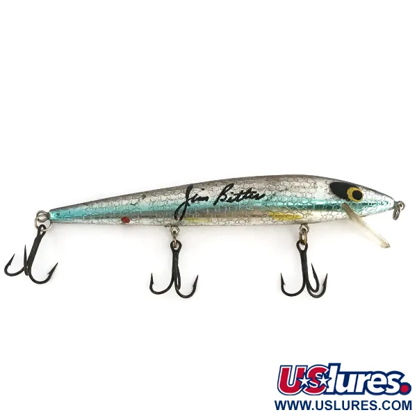 Une signature « Jim Bitter » orne le flanc de ce spécimen aux écailles argentées, l'identifiant comme un outil de qualité professionnelle de la gamme Smithwick. Pesant 10 g (1/3 oz) et mesurant 11,5 cm (4 1/2"), le Suspending Rattlin’ Rogue présente une finition en feuille d'argent texturée qui vire au bleu vif le long du dos. Ce modèle, identifié par le code produit 8101, est un poisson-nageur à billes classique conçu pour la polyvalence, atteignant des profondeurs de 0,3 à 2 m au lancer et jusqu'à 3 à 4 m à la traîne. Le dessus du leurre est marqué « RATTLIN' ROGUE » en lettres noires, complété par trois hameçons triples sombres et une bavette transparente. De grands yeux noirs et jaunes offrent une cible à haut contraste près de la tête. Fabriqué aux USA, ce leurre est en excellent état, avec une note de 5/5 pour sa finition propre et ses composants intacts.