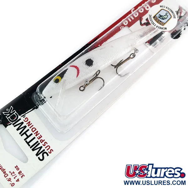 Des écailles blanc transparent associées à une marque rouge vif au niveau des ouïes et un point latéral noir distinctif définissent le look de ce Smithwick Suspending Rattlin’ Rogue. Mesurant 11,4 cm pour 10,6 g, ce jerkbait fabriqué aux États-Unis porte le code 9808. Ce modèle est neuf, conservant sa finition d'origine et ses hameçons triples bronzés affûtés. Conçu comme un "Pro Rogue", le leurre est équilibré pour rester neutre (suspending) dans la colonne d'eau, atteignant des profondeurs de 0 à 1,8 m au lancer et de 3,0 à 4,0 m à la traîne. Le système de billes interne ajoute un élément sonore technique à sa nage. La bavette transparente intégrée au corps garantit le maintien de sa trajectoire de profondeur lors des récupérations ou des pauses.