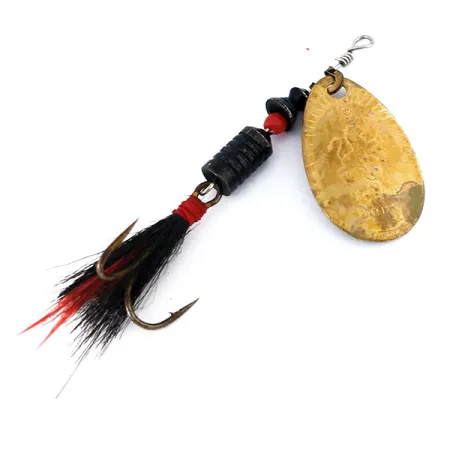La finition en laiton sur la palette en forme de goutte d'eau de 6 cm (2 1/4") présente un vieillissement naturel et doux correspondant à une note de 4/5. Ce South Bend 3, répertorié sous le code produit 10636, est représentatif de la fabrication classique des USA et pèse 7 g (1/4 oz). L'axe central supporte un corps lesté composé de segments rainurés noirs et d'accents de perles rouge vif, créant un profil visuel contrasté. À l'arrière, l'hameçon triple est garni de plumes noires naturelles avec des reflets rouges distincts, un détail destiné à offrir une silhouette plus volumineuse dans l'eau. L'armature reste solide, avec un émerillon fonctionnel en tête et un axe droit. Une légère usure de surface sur les composants en laiton confirme son histoire vintage tout en préservant son intégrité structurelle pour la collection ou la pêche légère.