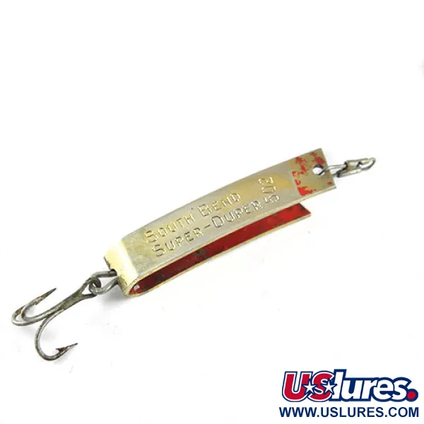 Estampillé dans le métal doré, le marquage « SOUTH BEND SUPER-DUPER 502 » identifie cette pièce comme un exemple classique du matériel de pêche du milieu du siècle. Mesurant 3 cm (1 1/4") et pesant 2,5 g (3/32 oz), ce leurre présente un design distinctif en forme de U qui lui permet de servir d'hybride entre une cuillère oscillante et une cuillère tournante. La face externe est plaquée d'un or réfléchissant, tandis que l'intérieur de la courbure est revêtu d'une finition rouge profond. Au revers, les informations de brevet d'origine, « PAT. NO. 2 713 378 », sont parfaitement lisibles, offrant un lien direct avec l'histoire technique de la marque South Bend. Noté 4/5, ce spécimen conserve l'éclat de ses couleurs et son intégrité structurelle, ne présentant que de légères traces liées à son âge. L'armement est conforme à l'époque, équipé d'un hameçon triple robuste à l'arrière et d'un émerillon à agrafe fonctionnel en tête pour le lancer. Ce modèle spécifique, code produit 17827, constitue un choix léger pour les pêcheurs ciblant la truite ou les petits carnassiers avec un matériel ultra-léger.