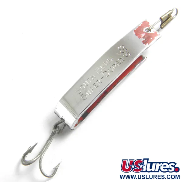 Portant l'inscription South Bend Super-Duper 503 sur sa surface nickelée, ce leurre métallique spécifique présente la courbure en U caractéristique qui a fait de ce modèle un grand classique des boîtes à pêche du milieu du siècle. Avec un poids de 1/8 oz (4,3 g) et une longueur de 1 1/2" (3,5 cm), sa conception est parfaitement adaptée pour le lancer léger et la traîne. La finition nickelée est agrémentée d'une touche de peinture rouge près de l'attache, montrant quelques légères traces d'usage typiques d'une pièce vintage authentique. Classé dans un état de 4/5, le métal conserve un brillant soutenu malgré de légères marques de surface. L'armement se compose d'un hameçon triple d'origine et d'une attache de couleur laiton. À l'intérieur de la courbure, le numéro de brevet original est parfaitement lisible, confirmant qu'il s'agit d'un produit South Bend authentique fabriqué aux États-Unis.