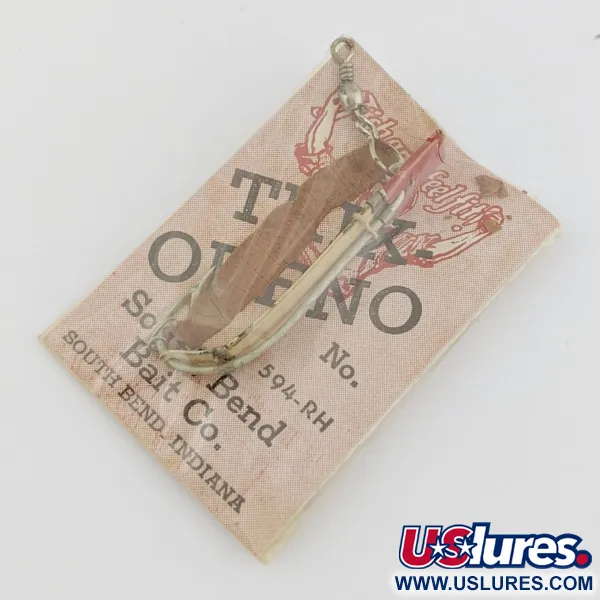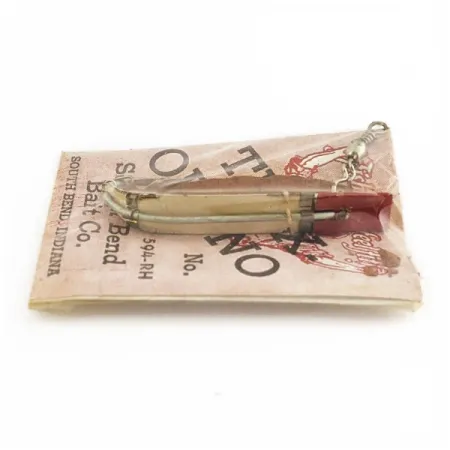 Mesurant 4,5 cm (1 3/4"), ce leurre pour canne à mouche à la finition argent et rouge est resté à l'état neuf sur sa carte de présentation d'origine. South Bend a fabriqué ce modèle 594-RH d'un poids de 2 g (1/16 oz), spécifiquement conçu pour une action coulante imitant de petits insectes ou des vairons. Il est possible d'atteindre les truites en eau profonde lors des changements de température saisonniers car le corps réagit au moindre mouvement du scion. La conception inclut une petite lamelle métallique, et la carte d'origine fournit des instructions pour ajouter une couenne de porc à l'hameçon afin d'augmenter la visibilité. Les informations au dos de l'emballage indiquent que cette série comprenait également les modèles 593 et 594D pour diverses applications de pêche ultra-légère. Code produit 24506.